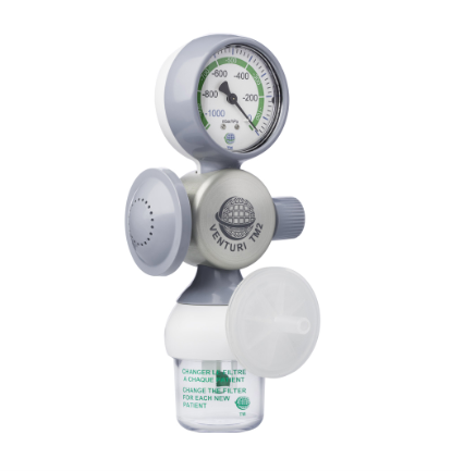 The VENTURI TM2 ejector is used to create, to adjust and to measure a suction from a source of pressured gas on the wall or from a cylinder (oxygen or medical air). It enables to suck in liquids or mucus in the absence of vacuum pipeline network. The VENTURI TM2 ejector should be connected either to a source of pressured gas on the wall, using a direct probe or a rail mounting system, or a cylinder through a pressure regulator fitted with a quick-release connector. The VENTURI TM2 ejector should be associated with a collection jar and a suction hose.